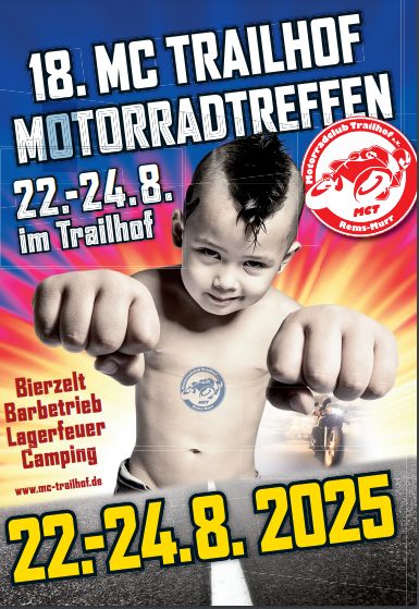 Wir laden wir euch herzlich ein zu unserem traditionellen Motorradtreffen am Trailhof – drei Tage voller Power, Spaß und guter Musik!